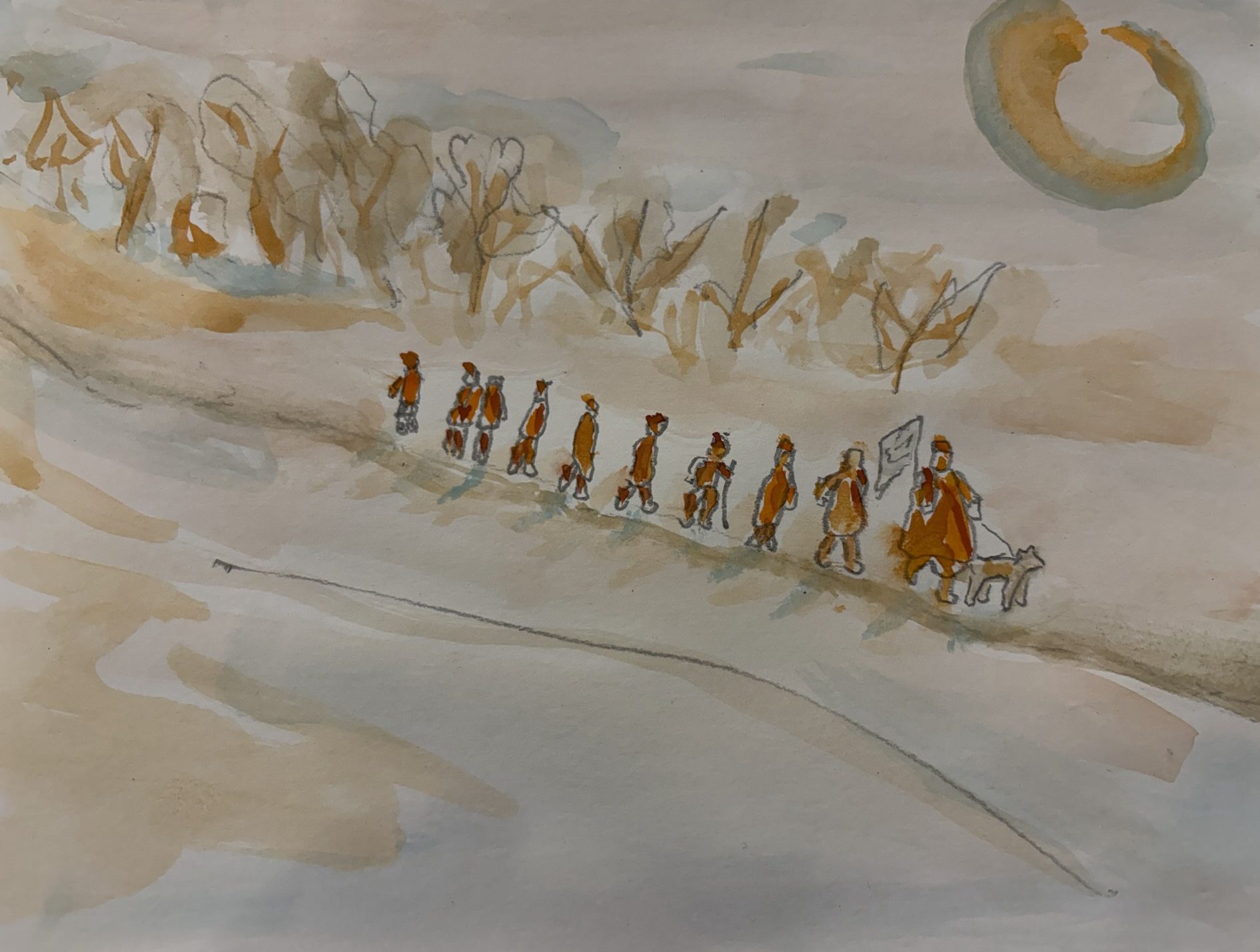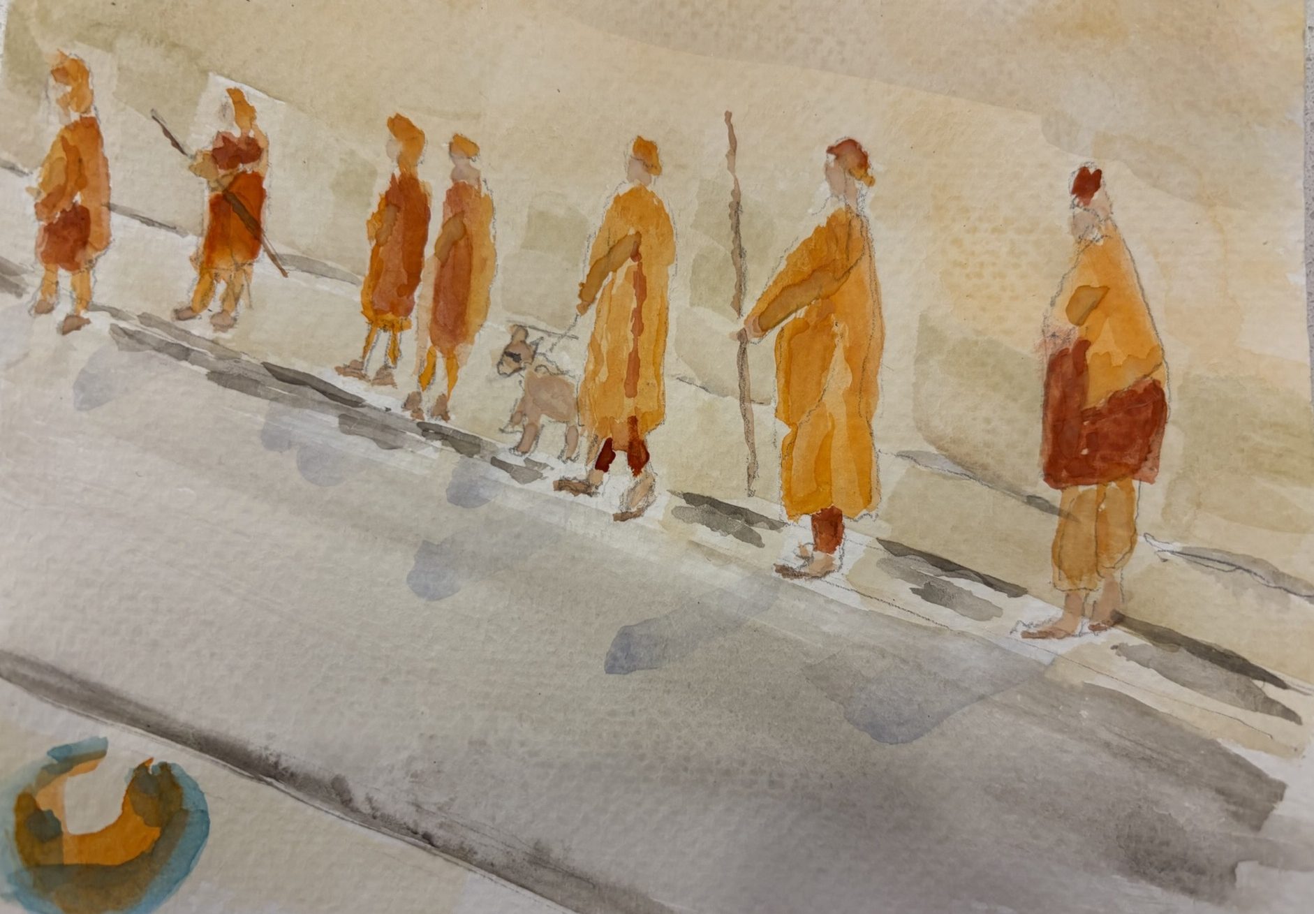 The Buddhist monks walking from Texas to Washington, D.C. and returning home this weekend have captured the hearts and minds of so many on their journey. Me included! I became enamored with the work of Thich Nhat Hanh in seminary and have tried to nurture mindfulness throughout my life’s journey. The practcie of meditation is a challenge, though rewarding. Painting–the same! While I have not spent any time working on painting or sketching people, I wanted to create a few images of the monks. Here goes…